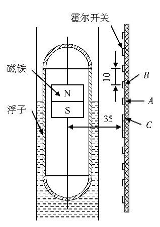算出磁性浮子的磁場(chǎng)分布,根據(jù)測(cè)量精確度、霍爾開(kāi)關(guān)的磁場(chǎng)強(qiáng)度閡值、霍爾開(kāi)關(guān)到浮子的距離等己知條件計(jì)算出浮子內(nèi)磁鐵的大小,簡(jiǎn)化了工藝流程,減少了工作量。在程序設(shè)計(jì)時(shí),