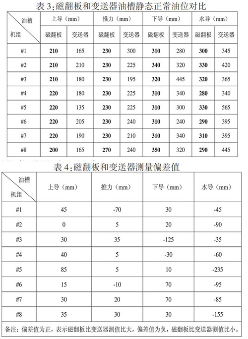 3.變送器測量油槽靜態(tài)油位與磁翻板存在偏差,數(shù)據(jù)對比如表3: