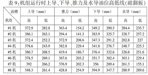 表9中數(shù)據(jù)可以作為目前油位高低報警的參考線,但是由于目前汛期不具備條件消缺,等到2015~2016年度檢修期間,可以參考該數(shù)據(jù)和二灘、官地電廠定值對油位高低報警線進(jìn)行調(diào)整,磁開關(guān)根據(jù)表9進(jìn)行調(diào)整。