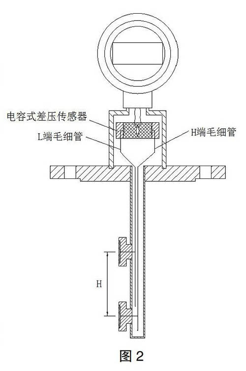我們?cè)O(shè)想用差壓原理,將差壓高壓端(H端)做出充油的毛細(xì)管和受壓膜盒,毛細(xì)管加膜盒長(zhǎng)度為從帶壓容器上的連接器到容器底部;差壓變送器低壓端(L端)也做一個(gè)膜盒,膜片直徑同高壓端的膜盒。這個(gè)膜盒置于上端的容器內(nèi),連接器下,也可以置于連接上邊的封閉腔室內(nèi),封閉腔室與連接器(法蘭)上有差壓傳感器低壓端引壓孔,與被測(cè)容器相連。用以自動(dòng)減去容器內(nèi)壓力。為了使差壓變送器高低端由于真空下充灌硅油等導(dǎo)壓介質(zhì)對(duì)差壓造成的誤差盡可以少,將低壓端的毛細(xì)管做成與高壓端等長(zhǎng),毛細(xì)管下端封閉。這樣,雙向毛細(xì)管所產(chǎn)生的壓力幾乎相等,產(chǎn)生差壓幾乎為零。這樣設(shè)計(jì)還有另外一個(gè)重要功能,就是,無(wú)論充填什么樣的導(dǎo)壓介質(zhì),都要產(chǎn)生膨脹與收縮,只要有溫度變化,這種變化就有,由于雙向等長(zhǎng)等容,兩個(gè)膜盒幾乎處于同一溫場(chǎng),這種溫度變化產(chǎn)生的影響可以自動(dòng)抵消,由充填導(dǎo)壓介質(zhì)產(chǎn)生的誤差很小。