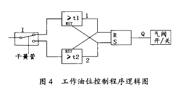 液位計筒體內(nèi)徑d/~i0mm,標尺長750mm。750mm×20%=150mm,280÷750=37.3%),液位計油位滯后于貯罐油位變化。液位計回油時,浮筒漂向管口,則阻尼作用更強了,低油位*限開關LB/LVL6不能及時動作和關閉氣閥LB/EV2是造成貯油罐泄空而計算機未執(zhí)行油位故障處理程序的原因。圖3 液位計故障剖析圖3.2 液位檢測開關和控制程序干簧管式接近開關本身依靠磁控開或合,易受周圍磁場干擾產(chǎn)生誤動?,F(xiàn)場液位計安裝位置一側(cè)與電纜橋架相鄰,而另一側(cè)常有行車電磁吸盤吊裝鋼卷作業(yè)。從工作油位控制邏輯過程可以看出(圖4):盡管油位檢測開關已通,每15s(t1=t2=15s)內(nèi),只要存在一次脈沖干擾,開氣閥電路回路將未被選通。反之亦然。因此,干簧管式接近開關誤動產(chǎn)生錯誤控制,也是釀成事故的另一個原因。