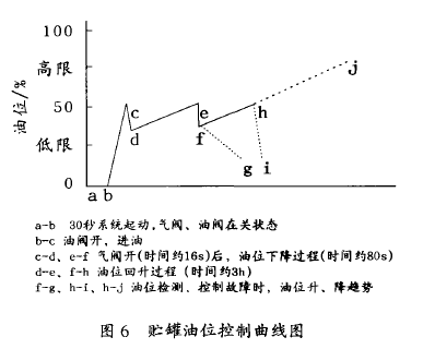 當檢測到油位低*限位開關信號(油位標尺的20%處,LB/LVL6動作)時,開始計時,氣閥在45s內(nèi)處在關閉狀態(tài),使罐內(nèi)油位上升。油位低信號解除后,進入正常工作油位控制程序。若45s后油位低信號仍然存在,則執(zhí)行油位低故障處理程序。