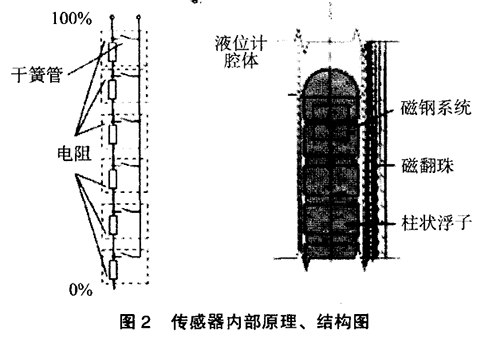 傳感器的作用是采樣液位高低位置并轉(zhuǎn)換成標準信號傳送至控制室,傳感器實際由干簧管和電阻組成。當浮子內(nèi)磁鋼位置變化后,磁場通過器壁帶動傳感器內(nèi)干簧管觸點吸合。干簧管吸合的位置決定回路的阻抗大小,干簧管的通常位置為10mm1組?;芈返拇笮≌门c液位的高低成正比,這樣*后由置于傳感器外殼內(nèi)的變送器將電阻信號轉(zhuǎn)換成標準的電流信號,送至控制室。具體結(jié)構(gòu)、原理圖見圖2。