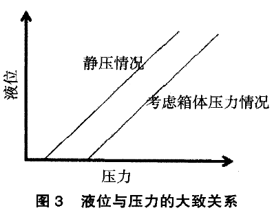 針對設備的故障,技術(shù)人員采取了更換多種質(zhì)量好的磁感應開關(guān)(如耐高溫型等),以及基于磁翻板的外貼式模擬量液位控制,但效果均不理想。其他液位測量(如超聲波等)造價較高,而且需要對設備進行相應的改造,并且停運一段時間,而該系統(tǒng)屬于公用,上述條件均無法滿足。既要實現(xiàn)自動控制,又要相應允許實施。技術(shù)人員再次結(jié)合系統(tǒng)圖進行了分析:該水位溢流處和下限處范圍還是比較寬裕,而且箱體為非承壓容器,所以箱體內(nèi)的壓力和大氣壓相差不大,即便是有也基本上保持恒定,結(jié)合原水位測量的結(jié)構(gòu),考慮在海水液位計的液位測量筒下部加裝1臺壓力變送器,在箱體壓力不是很大且基本恒定的情況下,液位與壓力值基本成對應關(guān)系(只是在現(xiàn)場修正疊加一個常數(shù)值來消除箱體上不恒壓所帶來的偏差)。液位與壓力的關(guān)系曲線見圖3。