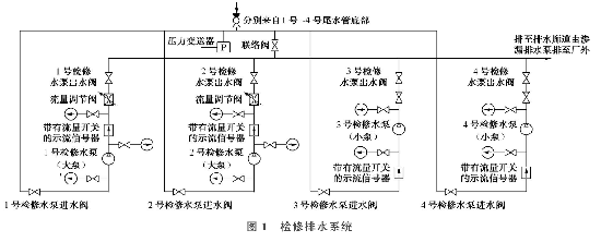 每臺檢修水泵均配置逆止閥、壓力表和帶流量開關的示流信號器,在1號、2號水泵出水管處各安裝了一個流量調節(jié)閥。系統(tǒng)中共有2根總管,一根為水泵的總吸水管,包括從每臺機組尾水管底部至總管的支管,總吸水管和部分支管及管路上的操作閥門布置在廠房管路廊道中;另一根為總排水管,可將水排至滲漏集水井中,再經(jīng)滲漏排水泵排至下庫。
