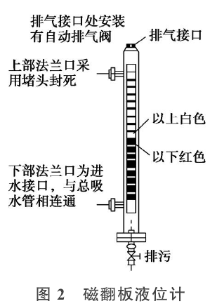 三、磁浮球液位計替換壓力變送器的技改針對壓力變送器測量尾水管水位時,測量值產(chǎn)生誤差的缺陷,對壓力變送器的動作條件以及現(xiàn)場的實際情況進行了初步分析,認為利用連通器的原理,在總吸水管上面安裝一套浮子式的水位開關,這樣既能直觀地反映實時水位,又能保證水泵的安全、可靠運行,浮子開關的位置可以根據(jù)實際的工作水位進行布置,利用浮子的開關量去控制水泵的正常啟停。經(jīng)查找多方面的資料以及咨詢相關設備的廠家后,決定對檢修排水系統(tǒng)增加一套水位測量裝置,具體方案為:在水泵的總吸水管上面安裝一套磁浮球液位計,如圖2所示。