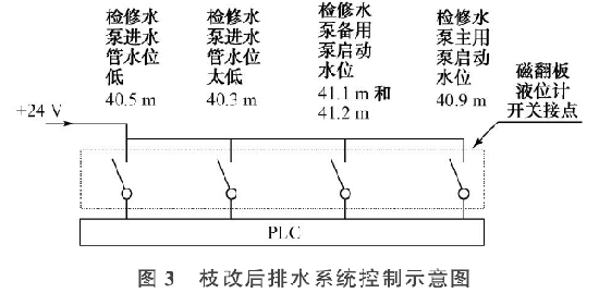 它結構是利用旁通管的原理,主導管內的液位和尾水管內的液位高度一致,根據(jù)阿基米德定理,磁性浮子在液體中產(chǎn)生的浮力和重力平衡,當尾水管中的水位升降時,液位計主導管內的浮子也隨之升降,浮子內的永久磁鐵通過磁耦合驅動指示器內的翻板指示器,當液位上升或下降時,翻板指示器由白色翻轉為紅色,或由原來的紅色翻轉為白色,指示器的顏色改變的高度就是被測水位的實際高度,從而實現(xiàn)液位的現(xiàn)場指示,以供運行人員目測尾水管的實時水位。安裝于液位計管壁外側的磁記憶開關,可多點設置、滑動調整位置,提供了液位開關量報警功能。在裝置的頂部安裝了一個自動排氣裝置,當主導管內液位上升時能夠自動的排氣,下降時能夠按時補氣。現(xiàn)場安裝磁浮球液位計時,裝置標尺的0位,對應的實地高程為EL.40.0 m。浮子開關設定5個水位動作值,檢修水位低開關量報警值對應的高程為40.3 m;停止所有檢修水泵的開關量,所對應的高程為40.5 m;啟動主用檢修水泵的開關量,所對應的高程為40.9 m;啟動檢修水泵主用泵的開關量,以及要求手動啟動大泵,并作為水位高報警上送上位機,所對應的高程為41.1 m與41.2 m,兩個開關量并列接入。全部開關量分別送入PLC,如圖3所示。