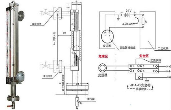 液體液位計是以浮子內(nèi)磁鋼驅(qū)動雙色薄片的翻轉(zhuǎn)來指示液位的一種新型儀表,主體不銹鋼內(nèi)腔管中磁浮子隨液位的升降而上下運(yùn)動,同時驅(qū)使主體外指示器內(nèi)的雙色薄片翻轉(zhuǎn),有液位時轉(zhuǎn)示紅色、無液位時顯示白色。液體液位計以紅色和白色色帶間的界線即代表液位高度。在指示器左側(cè)配有醒目的刻度標(biāo)尺,從而使液位的指示顯得更加清晰。不僅可以實(shí)現(xiàn)現(xiàn)場就地觀測,也可以加裝遠(yuǎn)傳裝置實(shí)現(xiàn)遠(yuǎn)程監(jiān)控及報警等功能。