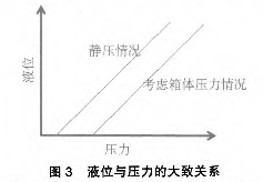 針對設(shè)備的故障,技術(shù)人員采取了更換多種質(zhì)量好的磁感應(yīng)開關(guān)(如耐高溫型等),以及基于磁翻板的外貼式模擬量液位控制,但效果均不理想。其他液位測量(如超聲波等)造價較高,而且需要對設(shè)備進(jìn)行相應(yīng)的改造,并且停運一段時間,而該系統(tǒng)屬于公用,上述條件均無法滿足。既要實現(xiàn)自動控制,又要相應(yīng)允許實施。技術(shù)人員再次結(jié)合系統(tǒng)圖進(jìn)行了分析:該水位溢流處和下限處范圍還是比較寬裕,而且箱體為非承壓容器,所以箱體內(nèi)的壓力和大氣壓相差不大,即便是有也基本上保持恒定,結(jié)合原水位測量的結(jié)構(gòu),考慮在帶報警開關(guān)磁翻板液位計的液位測量筒下部加裝1臺壓力變送器,在箱體壓力不是很大且基本恒定的情況下,液位與壓力值基本成對應(yīng)關(guān)系(只是在現(xiàn)場修正疊加一個常數(shù)值來消除箱體上不恒壓所帶來的偏差)。液位與壓力的關(guān)系曲線見圖3。