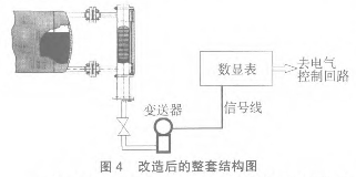在外配1塊可輸出開關(guān)量接點的模擬量顯示儀表,這樣可實現(xiàn)液位的自動控制,集體的偏差多少可以在就實際進(jìn)行整定試驗。整套測量系統(tǒng)的結(jié)構(gòu)圖見圖4。