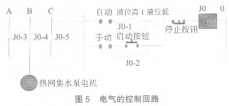 電氣的控制回路見圖5,這樣將數(shù)顯表的接點引入控制回路,可以實現(xiàn)液位高低的自動控制。同時見圖5集水箱帶報警開關(guān)磁翻板液位計下測點位置與變送器的位置之間可以存一段冷卻后的水,這樣可以保證變送器不會被高溫度的疏水而損壞。