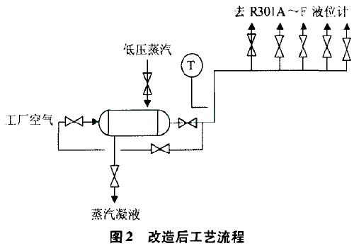 此次試驗的成功為徹底解決乙烯球罐磁翻板結(jié)冰提供了寶貴的經(jīng)驗,因此將試驗期間所用的臨時管線和設(shè)備經(jīng)過進一步完善,于2016年4月底完成全部乙烯球罐(R301A-F)耐酸堿磁翻板液位計的改造,液位計上的空氣吹掃管為自制設(shè)備,進氣端裝一閥門用于調(diào)節(jié)空氣量,另一端封閉,在靠進液位計翻板側(cè)每間斷開5cm一個中的孔用于空氣吹掃為保證吹掃空氣的溫度在加熱器出入口增加一旁線,流程見圖2。