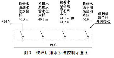 現(xiàn)場(chǎng)安裝石灰液位計(jì)時(shí), 裝置標(biāo)尺的0 位, 對(duì)應(yīng)的實(shí)地高程為EL .40 .0 m 。浮子開關(guān)設(shè)定5 個(gè)水位動(dòng)作值, 檢修水位低開關(guān)量報(bào)警值對(duì)應(yīng)的高程為40 .3 m ;停止所有檢修水泵的開關(guān)量, 所對(duì)應(yīng)的高程為40 .5 m ;啟動(dòng)主用檢修水泵的開關(guān)量, 所對(duì)應(yīng)的高程為40 .9 m ;啟動(dòng)檢修水泵主用泵的開關(guān)量, 以及要求手動(dòng)啟動(dòng)大泵, 并作為水位高報(bào)警上送上位機(jī), 所對(duì)應(yīng)的高程為41 .1 m 與41 .2 m , 兩個(gè)開關(guān)量并列接入。全部開關(guān)量分別送入PLC , 如圖3所示。