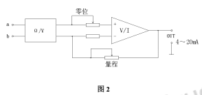 來自液位傳感器的對應(yīng)液位高度的電阻信號,進(jìn)入圖2所示的a,b端,經(jīng)處理后*終輸出4~20mA DC標(biāo)準(zhǔn)信號。