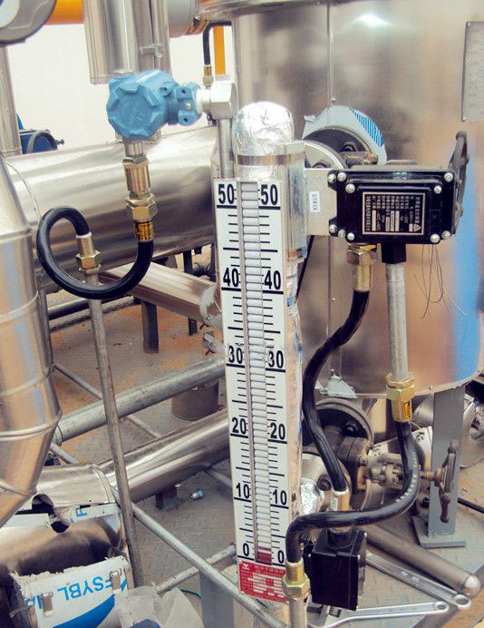 鑒于煤油儲罐液位計具有被測介質(zhì)與指示機構完全隔離,密封性能好,防泄漏、適應腐蝕條件下的液位測量等優(yōu)點,且可靠性高、耐振性能好、結構簡單、安裝方便、維護費用低,現(xiàn)已在電力、石油、化工、冶金、環(huán)保、船舶、建筑、食品等行業(yè)得到廣泛應用。本公司用戶上海某公司帶熱壓縮器低溫多效蒸餾海水淡化的濃鹽水、蒸餾水及冷凝水液位測量都采用帶遠傳的煤油儲罐液位計。為了防止結垢,需在低溫的情況下讓海水達到沸點,要求海水淡化裝置內(nèi)部處于負壓狀態(tài),正常運行時為-0.093MPa左右,此為用戶煤油儲罐液位計使用須達到的工藝要求,以下說明即為儀表在負壓狀態(tài)下發(fā)生管路漏氣的典型故障分析情況。