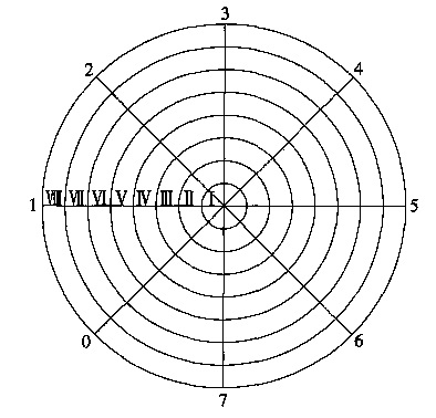 1.2.2 幾何測(cè)量法根據(jù)立式金屬罐容量試行檢定規(guī)程,把圓錐體底圓分成M 個(gè)同心圓,根據(jù)所分圓環(huán)面積相等條件決定半徑。圓錐體分為一個(gè)小圓錐和多個(gè)圓臺(tái)。在每個(gè)圓心圓周測(cè)N 個(gè)點(diǎn),即測(cè)N 個(gè)點(diǎn)到罐底中心的高度。底量測(cè)量原理見圖2。