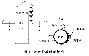 持續(xù)向空貯罐加油至液位計(jì)指示值37%時(shí),用時(shí)約15min。反之,排油液位計(jì)回零用時(shí)大于40min。在其它區(qū)域液位變化則快許多。通過(guò)對(duì)氯酸液位計(jì)結(jié)構(gòu)分析,我們發(fā)現(xiàn):圓柱體浮筒(~58mm×280mm)浮在0% ~37%區(qū)間時(shí),形同一個(gè)柱塞擋住了液位計(jì)簡(jiǎn)體下部的聯(lián)通管管口(見圖3,