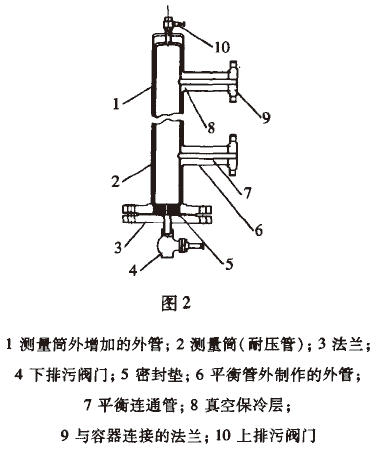 在原有的液位計(jì)結(jié)構(gòu)基礎(chǔ)上,在測量筒外增加一真空保溫層。由于測量筒中的液體跟容器中的液體是相同的,故測量筒外的真空保溫層阻隔了測量筒內(nèi)的低溫液體與外界空氣的溫度影響。實(shí)踐證明。此項(xiàng)改進(jìn)確實(shí)起到了良好的隔溫作用。但此結(jié)構(gòu)在實(shí)際裝置運(yùn)行中,平衡連通管周圍會凝結(jié)出大量冰塊。通過分析,由于測量筒與容器間是通過上下兩根平衡管相連接的,在液位計(jì)可正常指示時,下平衡管中始終充滿低溫液體。因在測量筒外增加的真空保溫層不能阻隔平衡管與外界的直接接觸,故在平衡管四周還是會出現(xiàn)大量的冰塊。
