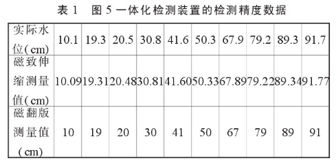 我們把圖5所示的一體化檢測裝置進(jìn)行了水位檢測實驗,其檢測結(jié)果與實際水位值見表1。