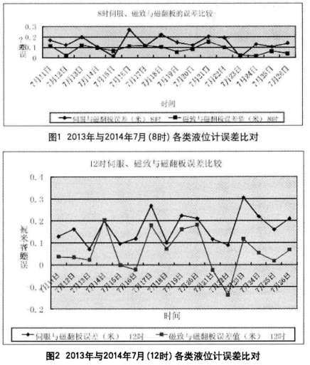 由以上兩圖得知,伺服液位計誤差值曲線較高,液位漲浮較大,計量誤差*髙達+0.3m,而磁致液位計誤差值曲線相對穩(wěn)定,液位漲浮較小,計量誤差在±0.2m之間,較為精準。