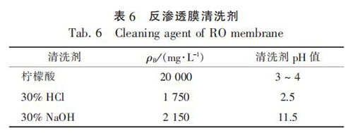 反滲透膜運行一定時間后, 污染物會在膜表面沉積, 需要定期進(jìn)行化學(xué)清洗以完全恢復(fù)膜性能。 本系統(tǒng)設(shè)計清洗周期為 3 個月, 清洗包括循環(huán)、 浸泡、 沖洗 3 個過程, 將清洗劑引入反滲透膜 組 , 按 每 支 膜 11.4 L / min 的 流 量 循 環(huán) 5 ~ 15min, 再將單支膜流量調(diào)至 22.8 L / min 循環(huán) 5 ~ 15min, 然后再將單支膜流量調(diào)至 35 L / min 循環(huán) 30 ~60 min, 隨后進(jìn)入浸泡階段, 1 ~ 2 h 后進(jìn)行沖洗,直至濃水電導(dǎo)率與進(jìn)水電導(dǎo)率相同。 反滲透膜采用先酸洗后堿洗的步驟進(jìn)行, 酸洗和堿洗均經(jīng)過上述過程, 酸洗劑可選用檸檬酸或 HCl, 堿洗劑選用 NaOH。 清洗劑選擇見表 6。