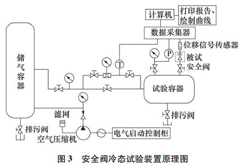 安全閥冷態(tài)試驗裝置( 見圖 3) 主要由壓縮氣源、儲氣罐、節(jié)流控制閥、試驗罐、閥門和管道、數(shù)據(jù)采集系統(tǒng)、控制系統(tǒng)等組成,可對公稱壓力 PN≤20 MPa,公稱通徑 DN≤150 mm 的安全閥進行整定壓力試驗、排放壓力試驗、回座壓力試驗、開啟高度試驗、排量及排量系數(shù)試驗,檢測參數(shù)和自動化程度達到國內(nèi)**水平。