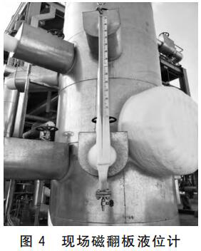 現(xiàn)場磁翻板液位計(圖4)由于儲罐壓力偏高,正常生產(chǎn)時為3MPa,導致磁翻版液位計浮子被壓扁。解決方法:尋找能夠生產(chǎn)耐高壓低密度液位計浮子廠家。