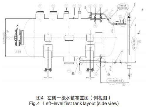 1)在每個疏水箱外部靠近水側(cè)取壓口處,安裝 3 個測量筒用于導(dǎo)波純水處理液位計的安置以及液位測量;每個測量筒的汽側(cè)取壓口仍然選用原導(dǎo)波純水處理液位計接口,而水側(cè)取壓口引用原水汽取樣口、磁翻板液位計取壓口,以左側(cè)一級水箱布置圖為例,見圖 4 左側(cè)一級水箱布置圖(側(cè)視圖)。
