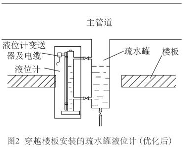 田灣核電3#、4#機組現(xiàn)場疏水罐液位測量*先采用兩個連通管把液位計測量筒與疏水罐連通,測量筒內部含有磁浮子,磁浮子高度隨疏水罐內液位變化,測量筒外部安裝測量桿,感受磁浮子高度,再通過下部變送器轉化成電流信號輸出到DCS系統(tǒng)。一些蒸汽管道安裝布置貼近地面,疏水罐穿越樓板,這樣就使液位計安裝后變送器位于樓板下部,即下一層廠房的房頂;如圖1所示。