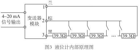 為尋求更好的改進方案,對高溫導熱油液位計的測量原理進行了深入研究。液位計測量桿中是由等間距排布的干簧管和電阻元件組成,當磁浮子達到某一高度時,對應的干簧管閉合,如果能識別出哪個干簧管閉合,即可獲得當前液位值。那么變送器又是如何識別出哪個干簧管閉合的呢?再次探究測量桿內部電路,繪制液位計內部原理圖,如圖3所示。測量桿內部電阻串聯(lián)連接,每兩個電阻的連接處連接干簧管的一端,干簧管的另一端并聯(lián)連接,*終引出蘭、棕、黑三根信號線。
