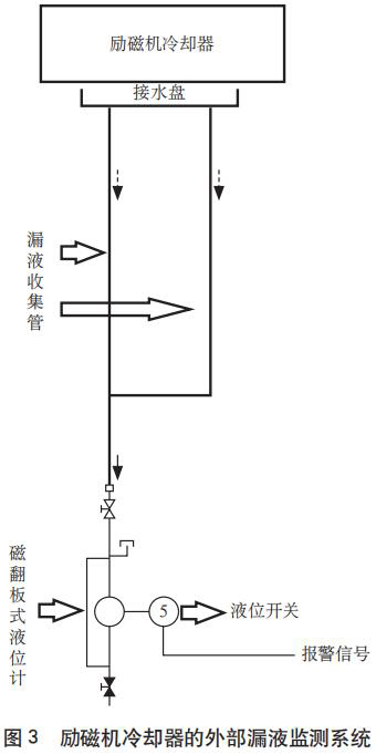 實際運行經(jīng)驗表明,防凍液位計內(nèi)部銅管發(fā)生泄漏的概率較低,但一旦發(fā)生泄漏,漏液會隨著冷卻空氣沿閉合風(fēng)路進入勵磁機內(nèi)部,造成勵磁機短路損壞的嚴重后果。為了保證機組安全,應(yīng)有冷卻器內(nèi)部銅管泄漏監(jiān)測裝置,然而現(xiàn)場沒有配置此類裝置。