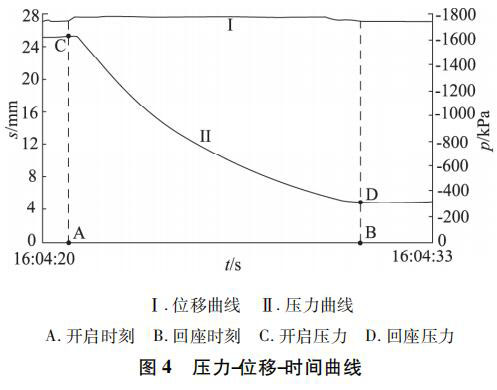 運(yùn)用安全閥冷態(tài)試驗(yàn)裝置對該凝結(jié)水液位計(jì)進(jìn)行動作性能試驗(yàn),將試驗(yàn)容器內(nèi)的介質(zhì)壓力卸放到整定壓力以下,開啟試驗(yàn)容器和安全閥進(jìn)口端的球閥,關(guān)閉流量計(jì)管路閥門,開啟主測試管路截止閥,開啟儲氣容器通向試驗(yàn)容器的節(jié)流閥,逐漸加壓,同時啟動計(jì)算機(jī)數(shù)據(jù)采集系統(tǒng),被試安全閥開啟,繼續(xù)升高壓力,直至被試安全閥保持全開啟( 排放) 狀態(tài),然后關(guān)閉儲氣容器通向試驗(yàn)容器的閥門,被試安全閥亦逐漸關(guān)閉。計(jì)算機(jī)自動生成試驗(yàn)過程的壓力、位移曲線,試驗(yàn)人員記錄采集開啟壓力、排放壓力、回座壓力、開啟高度等數(shù)據(jù)。重復(fù)上述試驗(yàn)至少 3 次,得到相應(yīng)壓力-位移-時間曲線,見圖 4。左縱坐標(biāo)為位置,右縱坐標(biāo)為壓力,其中上部曲線代表導(dǎo)閥位移,下部曲線代表壓力變化。當(dāng)導(dǎo)閥位置發(fā)生變化,代表導(dǎo)閥開始開啟動作,此時的壓力為該凝結(jié)水液位計(jì)的開啟壓力,即整定壓力; 當(dāng)導(dǎo)閥位置回到原點(diǎn)代表導(dǎo)閥已經(jīng)回座,此時對應(yīng)的壓力即為回座壓力。