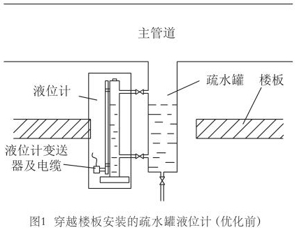 田灣核電3#、4#機組現(xiàn)場疏水罐液位測量*先采用兩個連通管把液位計測量筒與疏水罐連通,測量筒內部含有磁浮子,磁浮子高度隨疏水罐內液位變化,測量筒外部安裝測量桿,感受磁浮子高度,再通過下部變送器轉化成電流信號輸出到DCS系統(tǒng)。一些蒸汽管道安裝布置貼近地面,疏水罐穿越樓板,這樣就使液位計安裝后變送器位于樓板下部,即下一層廠房的房頂;如圖1所示。