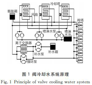 閥冷卻水系統(tǒng)主要構(gòu)成部分為閥內(nèi)冷水系統(tǒng)與閥外冷水系統(tǒng)。閥內(nèi)冷水系統(tǒng)主要通過(guò)內(nèi)冷水與閥組件直接接觸流動(dòng),將防爆型磁翻板液位計(jì)中熱量帶出,確保防爆型磁翻板液位計(jì)組件中晶閘管、水冷電阻、陽(yáng)*電抗器等發(fā)熱元件運(yùn)行溫度具有可控性。而閥外冷水系統(tǒng)主要通過(guò)閉式冷卻塔或風(fēng)機(jī)將內(nèi)冷水中熱量帶走,并排放至環(huán)境中。防爆型磁翻板液位計(jì)內(nèi)、外冷水系統(tǒng)的協(xié)同運(yùn)行,可以使防爆型磁翻板液位計(jì)組件內(nèi)部冷卻持續(xù)進(jìn)行,并滿足元器件結(jié)溫要求,進(jìn)而保證系統(tǒng)整體運(yùn)行穩(wěn)定性、安全性。閥冷卻水系統(tǒng)原理如圖1所示。