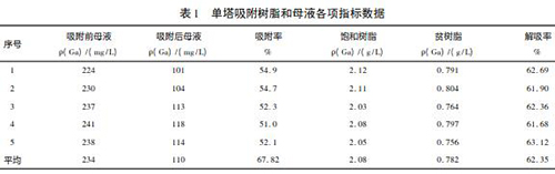 (1) 技改原理: 新樹(shù)脂入廠檢驗(yàn),飽和樹(shù)脂容量可以達(dá)到 2. 5 ~ 2. 8g /L。但在實(shí)際生產(chǎn)中由于含液位計(jì)母液的通過(guò)量不足,造成樹(shù)脂的吸附率較低,新樹(shù)脂飽和樹(shù)脂容量一般在 2. 0 ~ 2. 2g /L 之間。通過(guò)再增加一組吸附塔來(lái)進(jìn)行雙塔吸附,即提高了樹(shù)脂利用率,又充分利用了母液,提高樹(shù)脂的飽和度。采用雙塔交叉吸附工藝的升級(jí)改造,是在原有單塔吸附的基礎(chǔ)上增加一個(gè)吸附塔和一臺(tái)母液進(jìn)塔泵。兩臺(tái)母液進(jìn)塔泵分別向兩個(gè)吸附塔同時(shí)供液樹(shù)脂吸附飽和后,兩個(gè)吸附塔樹(shù)脂交叉進(jìn)行下步解吸工藝。表 1為單塔吸附工藝生產(chǎn)中取用的一組數(shù)。