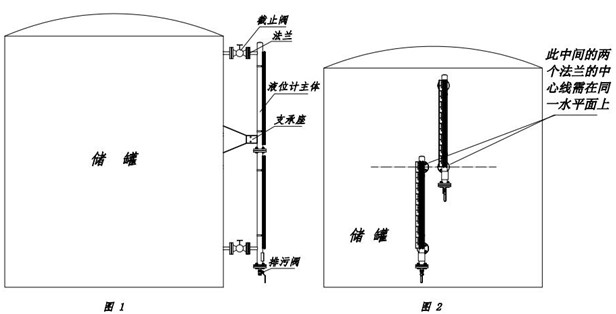 (9)對(duì)于超長(zhǎng)型磁翻板液位計(jì)(測(cè)量范圍大于4m),物流運(yùn)輸成本較高,一般進(jìn)行分段制作。分段方法有以下兩種形式,可根據(jù)客戶現(xiàn)場(chǎng)設(shè)備的實(shí)際接口形式而定。圖1形式是將一臺(tái)磁翻板液位計(jì)分成兩段,安裝時(shí)先組裝對(duì)接好連接法蘭,在進(jìn)行對(duì)接操作時(shí)可適當(dāng)松開顯示面板,支承點(diǎn)的數(shù)量根據(jù)磁翻板液位計(jì)的長(zhǎng)短來(lái)定。圖2形式是分成兩臺(tái)或若干臺(tái)獨(dú)立的磁翻板液位計(jì),這種形式的結(jié)構(gòu)要求儲(chǔ)罐中間的兩塊法蘭的中心線處在同一水平面上,以實(shí)現(xiàn)液位顯示的連續(xù)性。