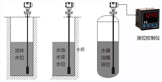 液位計應安裝在靜止的深井、水池中時,通常把內(nèi)徑Φ45mm左右的鋼管(不同高度打若干小孔,以便水通暢進入管內(nèi))固定于水中,然后將靜壓投入式液位計放入鋼管中即可使用。變送器的安裝方向為垂直,投入式安裝位置應遠離液體出入口及攪拌器。在有較大振動的使用場合,可在變送器上纏繞鋼絲,利用鋼絲減震,以免拉斷電纜線。測量流動或有攪拌的液體的液位時,通常把內(nèi)徑Φ45mm左右的鋼管(在液體流向的反面不同高度打若干小孔,以便水通暢進入管內(nèi))固定于水中,然后將靜壓投入式液位計放入鋼管中即可使用。 濕度傳感器探頭 , , 不銹鋼電熱管 PT100 傳感器 , , 下圖為不同工況下的投入式液位計的安裝方式: