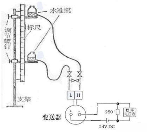 當(dāng)液體密度恒定時(shí),測出差壓就就可知道液位高度,而與液體容積無關(guān),或者說知道了液體高度,也就知道了差壓,即△P=ρH。模擬校驗(yàn)法就是基于上述原理進(jìn)行的。現(xiàn)以校驗(yàn)水位計(jì)為例,介紹一下具體方法,校驗(yàn)裝置及接線如圖所示: