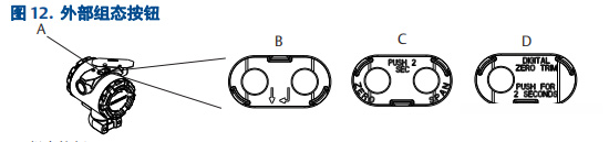 使用位于頂部銘*下、三組可能的外部組態(tài)按鈕中某一組進(jìn)行零點(diǎn)調(diào)校。為了操作組態(tài)按鈕,需要松開螺釘,滑動變送器頂部的銘*。參照圖 10 來確認(rèn)功能。