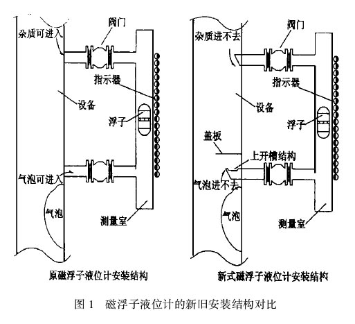 圖1四氟磁翻板液位計的新舊安裝結(jié)構(gòu)對比氣相總是要向上方或斜上方運動,這樣,氣相就不能置換掉下部接管中的液相,也就不能進人液位計測量室,就避免了氣泡對測量的干擾以及“亂磁”現(xiàn)象的產(chǎn)生。