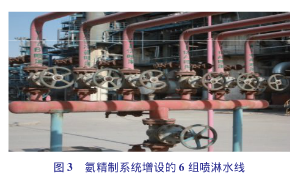 2)液氨儲(chǔ)罐增設(shè)噴淋系統(tǒng)。液氨易溶解于水,裝置增設(shè)霧狀水噴淋系統(tǒng)后,一旦液氨泄漏,從現(xiàn)場(chǎng)打開水噴淋系統(tǒng),就可*大減少氨的揮發(fā)。另外氨具有較高的體積膨脹系數(shù)。如:滿量充裝液氨的鋼瓶,在0~60℃范圍內(nèi),液氨溫度每升高1℃,其壓力升高約1.32~1.80MPa,致使液氨氣瓶超裝*易發(fā)生爆炸。為此液氨裝車點(diǎn)、液氨儲(chǔ)罐設(shè)置了降溫噴淋裝置。同時(shí),要求用罐車?yán)\(yùn)液氨時(shí),其充裝系數(shù)不得大于0.9。在新建120t/h的酸性水汽提裝置中,不但在液氨儲(chǔ)罐上增設(shè)噴淋系統(tǒng),而且在粗氨分液罐、氨結(jié)晶器、氨液循環(huán)罐等6組設(shè)備均增設(shè)了噴淋系統(tǒng)。具體見圖3。