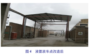 4)液氨裝車點(diǎn)移位改造。液氨裝車點(diǎn)不規(guī)范。根據(jù)相關(guān)要求,液氨裝車時(shí),周圍不能有機(jī)動(dòng)車通行,但液氨裝車點(diǎn)位于14號(hào)馬路西側(cè)5m處,對(duì)車輛及施工人員并無(wú)法完全封閉,裝車存在很大的安全風(fēng)險(xiǎn)。以前,液氨裝車由汽提崗位外操負(fù)責(zé),由于外操工作繁忙,造成液氨裝車過程的監(jiān)督時(shí)斷時(shí)續(xù),為解決這一隱患,車間指派專人負(fù)責(zé)監(jiān)管液氨裝車的全過程。監(jiān)管人員不但要檢查接頭有無(wú)泄漏,還要核實(shí)駕駛員和押運(yùn)員的資質(zhì)。車間根據(jù)液氨裝車的實(shí)際情況,編制《液氨裝車泄漏應(yīng)急操作卡》、《液氨裝車操作規(guī)程》,以便進(jìn)一步規(guī)范液氨裝車操作程序。應(yīng)分開設(shè)置液氨裝卸站的進(jìn)出口,當(dāng)進(jìn)出口合用時(shí),站內(nèi)應(yīng)設(shè)回車場(chǎng)。由于液氨裝車點(diǎn)東側(cè)5m處就是煉油區(qū)雨排系統(tǒng),為了解決液氨裝車過程泄漏噴淋水污染公司煉油區(qū)雨排系統(tǒng),在裝車點(diǎn)東西側(cè)各增設(shè)圍堰。從圖4可以看出:液氨裝車點(diǎn)改造后,現(xiàn)場(chǎng)更為規(guī)范,管理更為嚴(yán)格。