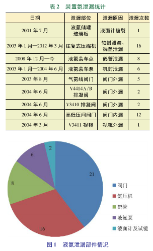 根據(jù)裝置長(zhǎng)期運(yùn)轉(zhuǎn)紀(jì)錄,泄漏部位的統(tǒng)計(jì)情況列于表2。液氨泄漏部件占比見圖1。