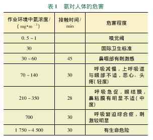 氨氣是一種無(wú)色透明而具有刺激性氣味的氣體,*易溶于水成為氨水(又稱氫氧化銨),呈弱堿性,1%水溶液pH值11.7。氨易液化,經(jīng)壓縮后成為液氨。根據(jù)衛(wèi)法監(jiān)發(fā)(2003)142號(hào)《高毒物品目錄》,氨氣屬于2.3類高毒氣體,8類腐蝕品,火災(zāi)爆炸危險(xiǎn)性類別為乙A類。氨與空氣混合到一定比例時(shí),遇明火能引起爆炸,其爆炸*限(體積分?jǐn)?shù))為15.5%~25%。低濃度氨對(duì)粘膜有刺激作用。高濃度氨可引起組織溶解性壞死、皮膚及上呼吸道粘膜化學(xué)性炎癥及燒傷、肺充血、肺水腫及出血等。常易發(fā)生輕度、重度中毒。外露皮膚可出現(xiàn)II度化學(xué)灼傷。氨對(duì)人體的危害見表1。